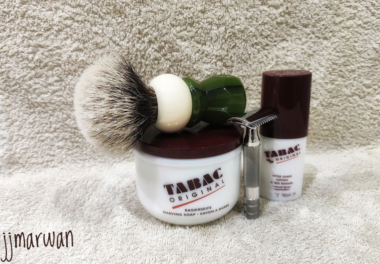 Floïd pre shave oil. Wolly Kaw, La fougère parfaite. Yaqi, Goblin: synthetic 24 mm tuxedo premium HD, fusion resin green and wood handle. Ali’s blade, Raptor 15/16, Suminagashi steel 23 layers / Shirogadmi 61 HRC. Brut, original lotion, balm aftershave & EdT.