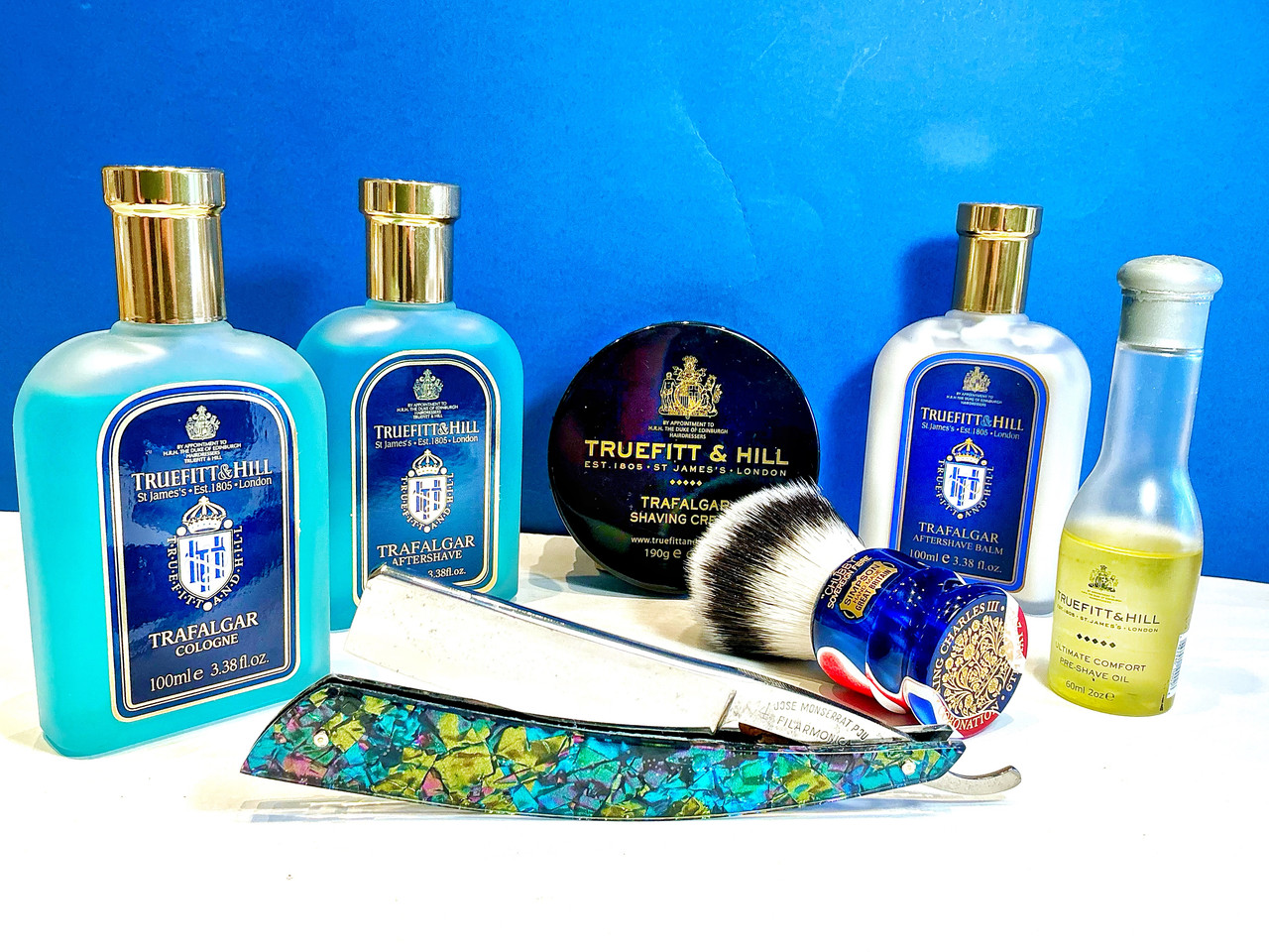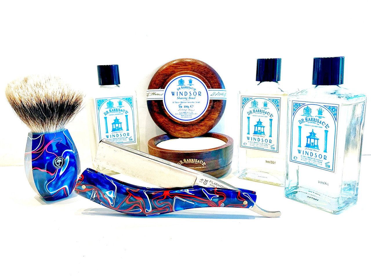 Floïd oil pre shave. Dr Harris: Windsor, shaving cream, lotion, balm aftershave & EdT. Pablo Fuertes @Airforce: a) Pomo (knob), shaving brush: Boti Two Band Badger Hair fan Knot 24 mm, Patriot kirinite handle. b) Jose Monserrat Pou: Filarmónica 14 Doble Temple, custom scales patriot kirinite.