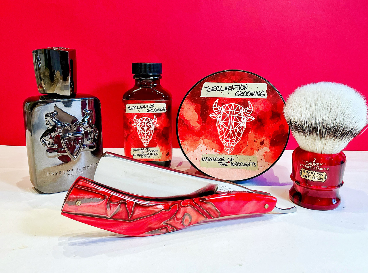 Floïd oil pre shave. Declaration Grooming: Massacre Of The Innocents, shaving soap & lotion aftershave. Simpson Chubby 2 Synthetic bristle, faux rubi handle. Guillermo Hoppe / Henkels, 14, custom rouge acrilic Melcorne scales by Pablo Fuertes. Parfums de Marly, Herod, EdP.
