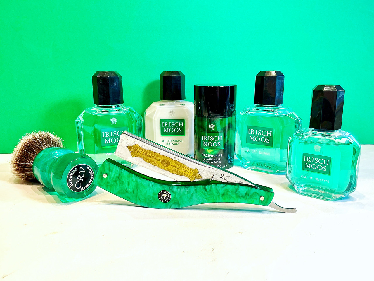 Mäurer & Wirtz, Sir Irisch Moos: Pre shave, shaving soap, lotion & balm aftershave, EdT. Carlos RUFIVK, CRV, “turquoise" two bands badger & resin handle. Jose Monserrat Pou: Filarmónica 14, Doble Temple, Water rippley emerald green scales by Pablo Fuertes & Airforce.