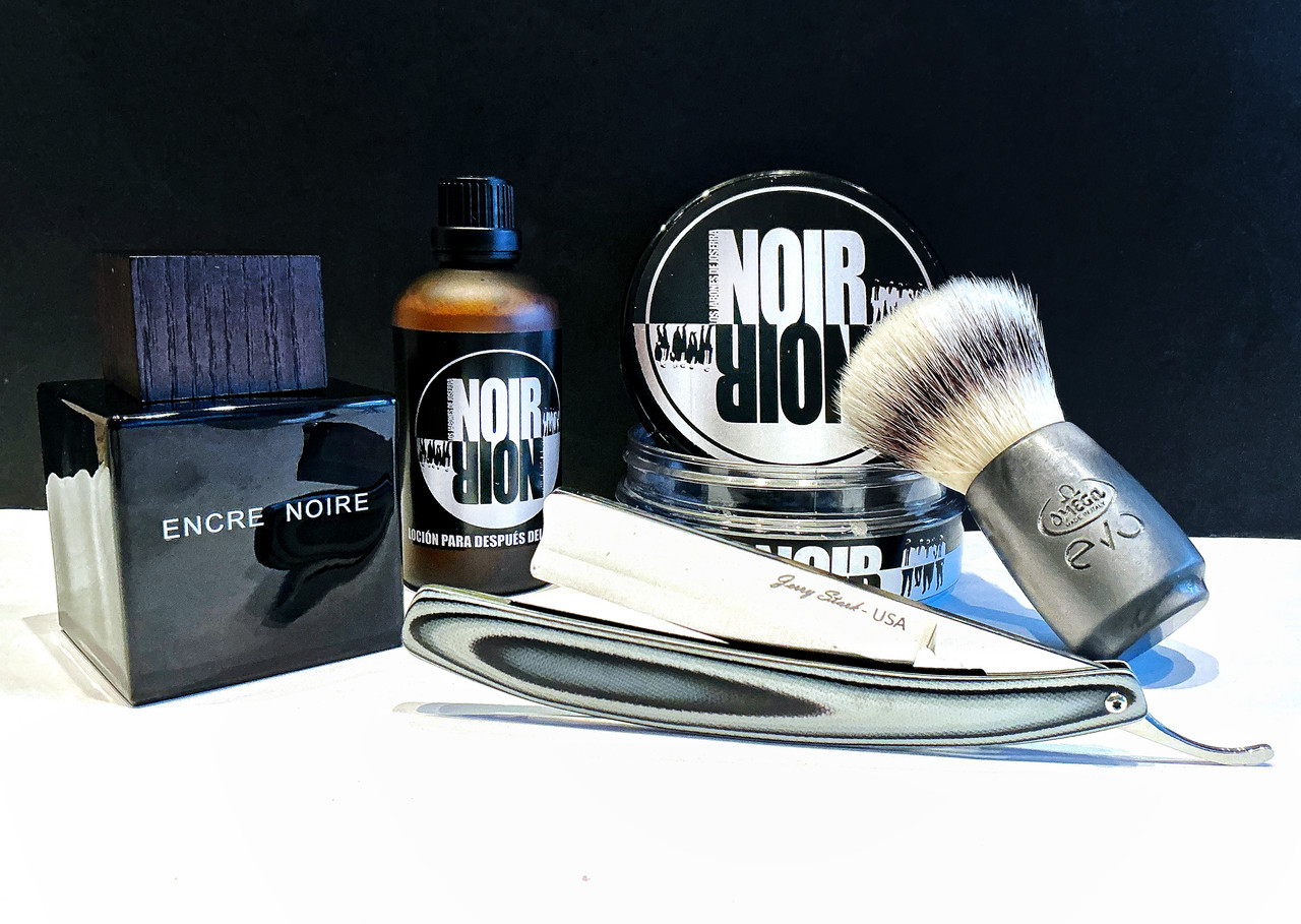 Floid, oil pre shave. Los jabones de Joserra, Noir: Shaving soap & lotion aftershave. Omega, EVO, Oval stone, synthetic shaving brush. Jerry Starck, 52100 steel, full hollow 6/8, G-10, grey & black. Lalique, Encre noir, Edt.