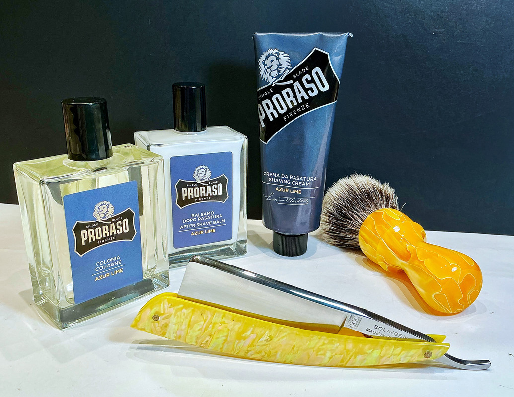 Martin de Candre: Huile végétale camomille et citron pre shave. Proraso, Azur Lime: Shaving cream, aftershave balm & Cologne. Leo Frisot, two bands badger, yellow resin handle. Revisor 8/8, custom yellow abalone scales.