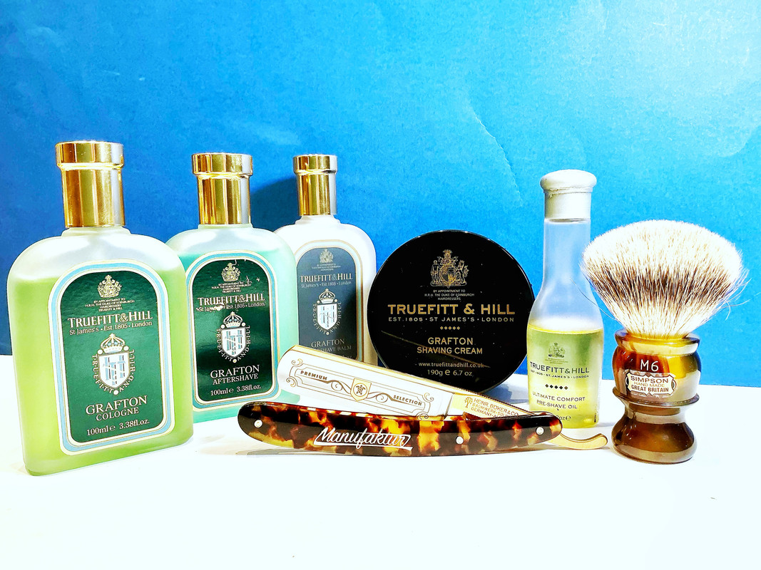 Truefitt & Hill: Oil pre shave; Grafton 1) Shaving cream, 2) Lotion, and 3) Balm aftershave. Simpson, best badger 22x34, m6 handle, fake tortoiseshell. Heinr. Boker & Co., Manufaktur, Tortoise Shell, carbon steel 5/8, faux carey scales.