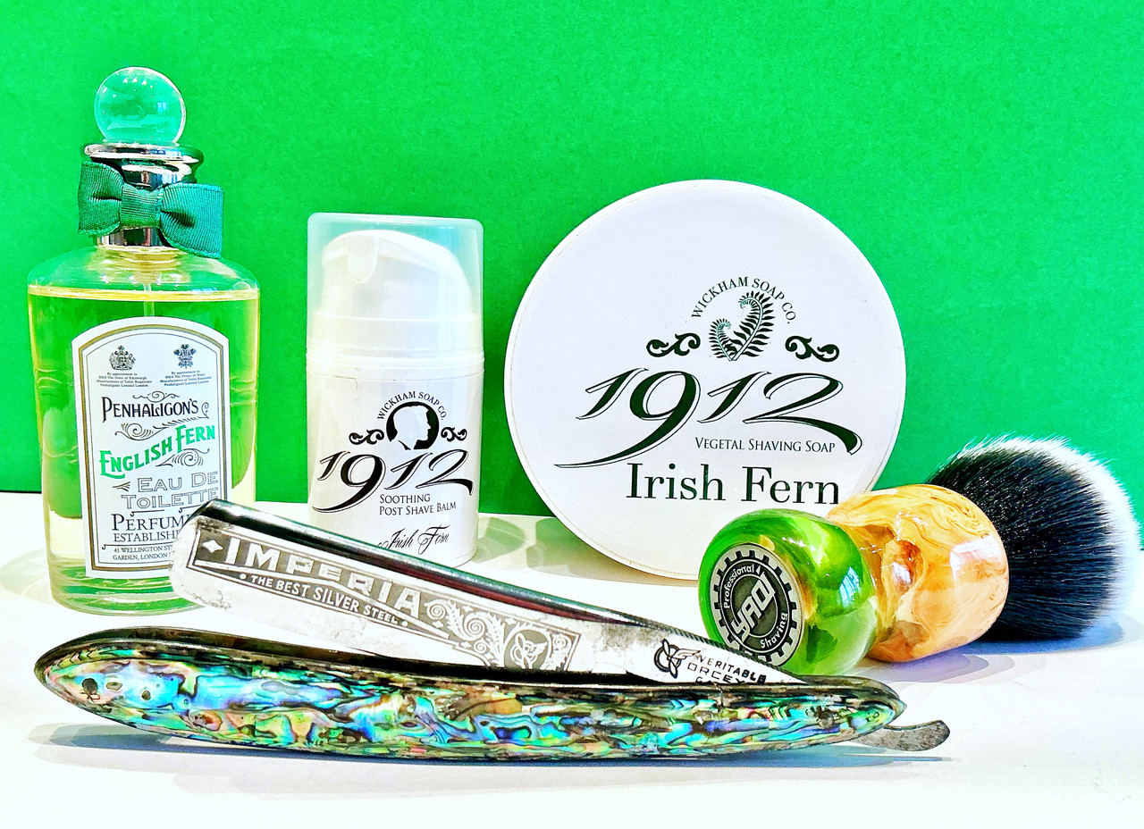 Wickham Soap Co., Irish Fern, shaving soap & balm aftershave. Yaqi, Pooka: synthetic 24 mm tuxedo premium HD, fusion resin green and wood handle. Veritablie Orceyre Garanti Imperia (“The best silver steel”), Thiers I., abalone scales. Penhaligons, English Fern, EdT.