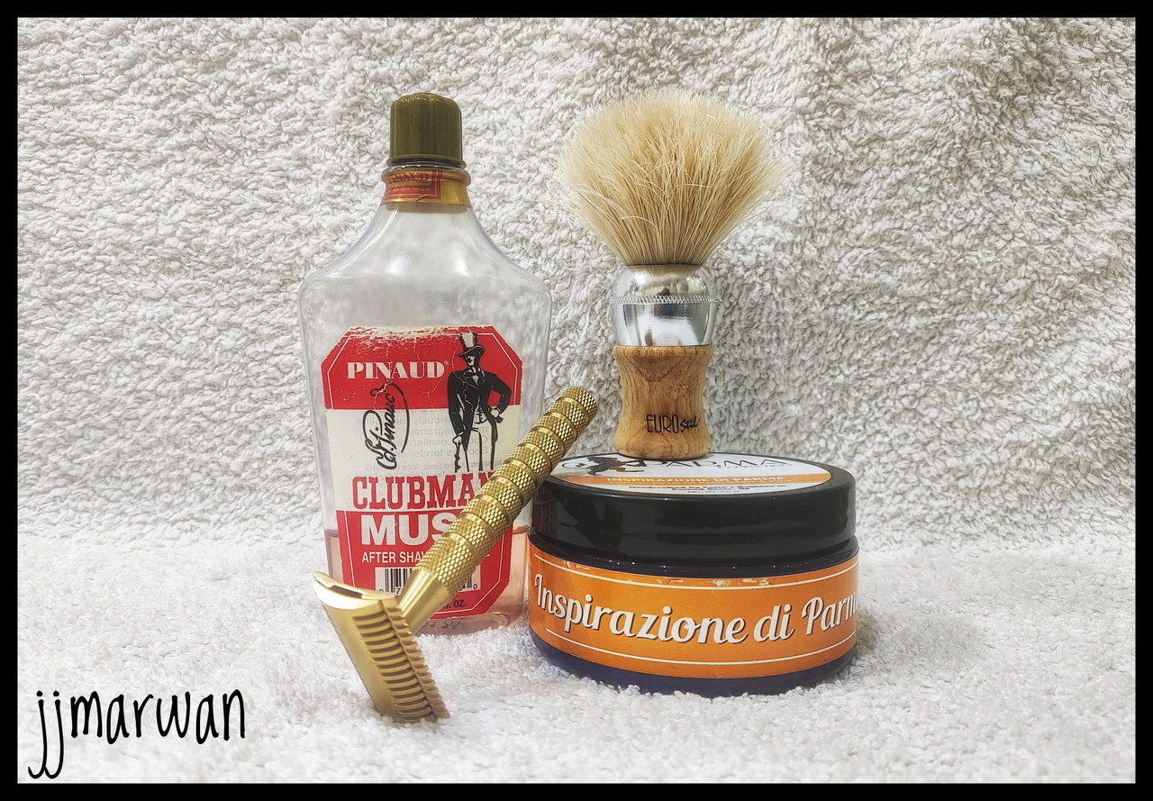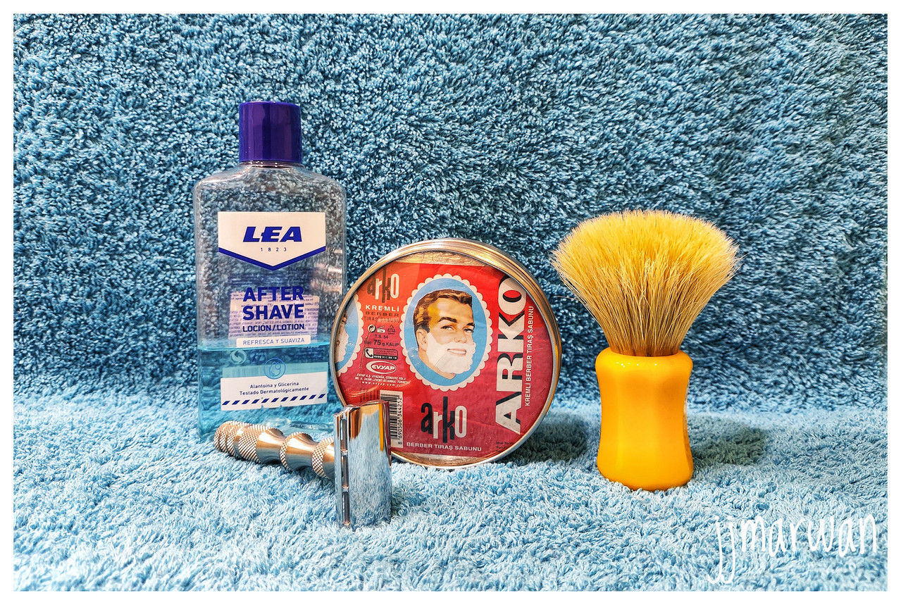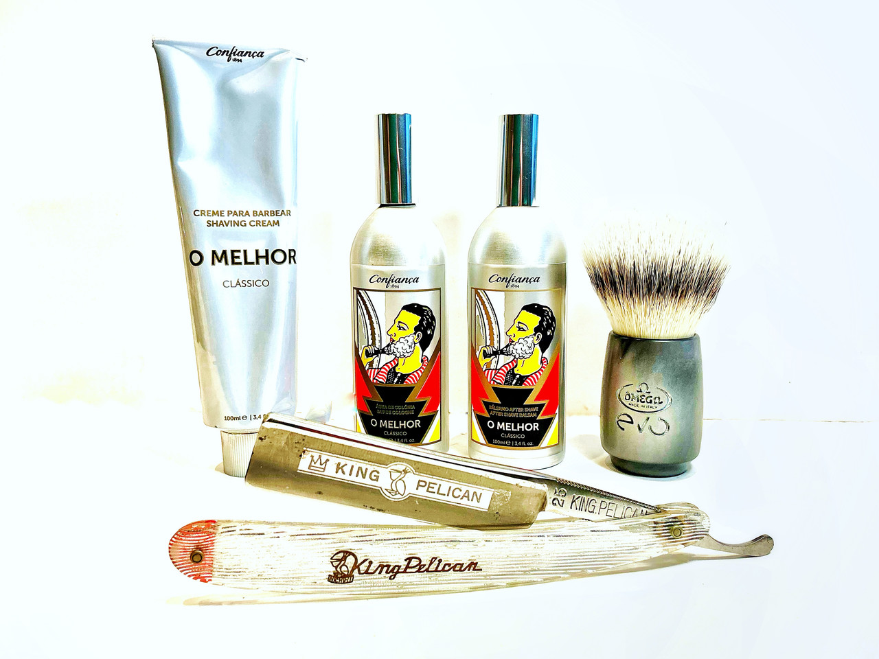 Martin de Candre: Huile végétale camomille et citron pre shave. Sabonaria e perfumaria Confiança, S.A., O Melhor: Shaving cream, balm aftershave & EdT. Omega, EVO, Oval stone, synthetic shaving brush. Nichiri Co.: King Pelikan 25: 100 Year Special Edition, blade width 13/16.