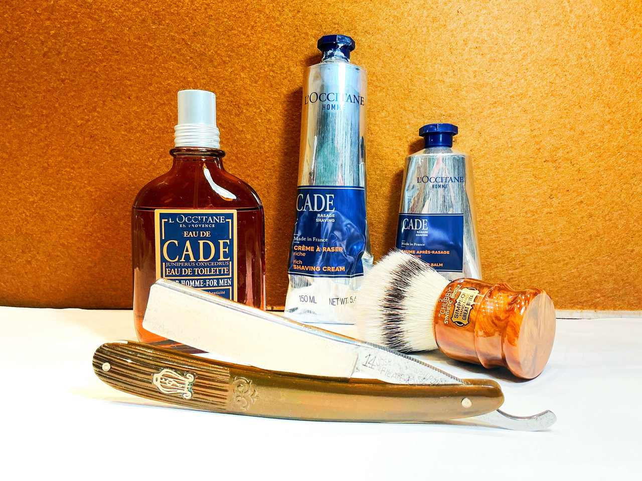 L’Occitane, Cade: Oil pre shave, Shaving cream, Balm aftershave & EdT pour homme. Sympson, chubby 2, shyntetic bristle. Jose Monserrat Pou, Filarmonica 14.