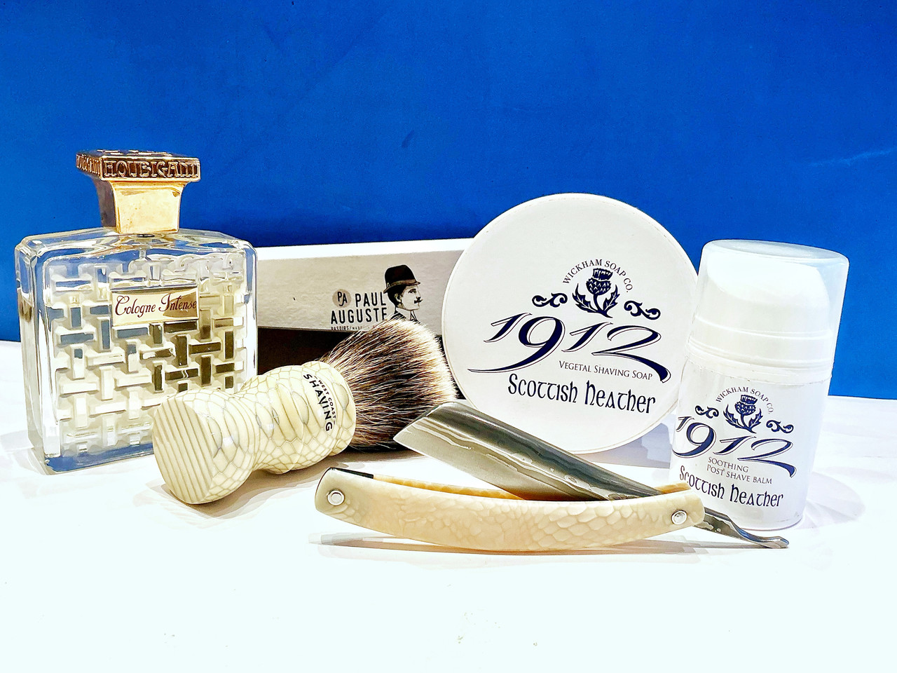 Floïd pre shave oil. Wickham shaving Co., Scottish heacher, shaving soap & aftershave gel. West Coast Shaving (WCS) Finest Badger Shaving Brush, Honeycomb White. Paul Auguste: Wester Kamisori Damas 6/8. Houbigant: Cologne Intense, EdT.