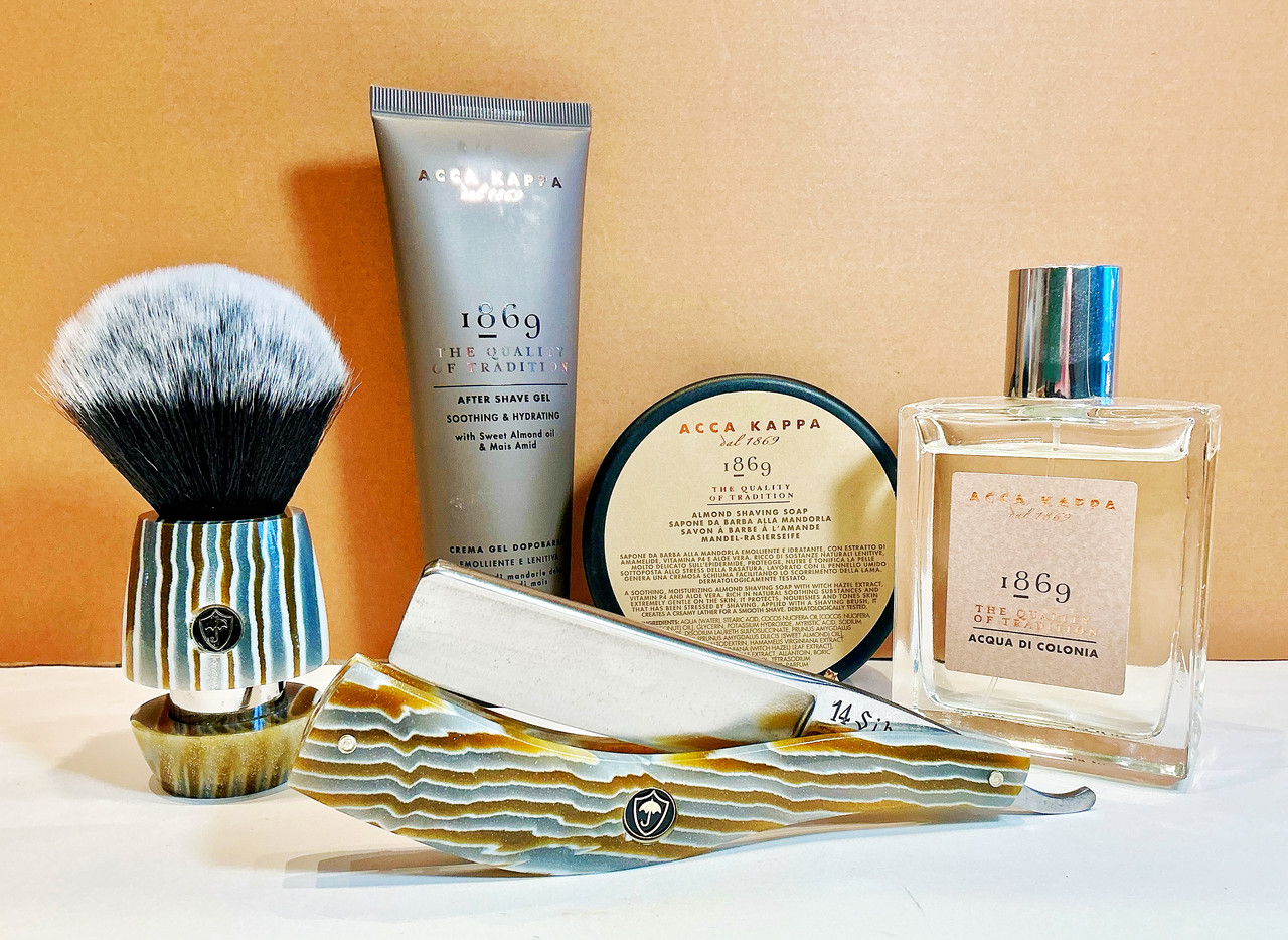 Martin de Candre: Huile végétale camomille et citron pre shave. Acca Kappa, 1869: Shaving soap, balm aftershave & EdC. Pablo Fuertes: Gold, white & silver poliester resin in: a) scales in Siboney 14, straight razor, and b) handle of shaving brush with Boti Brush-Tuxedo 2th Synthetic Hair Knot 24 mm.