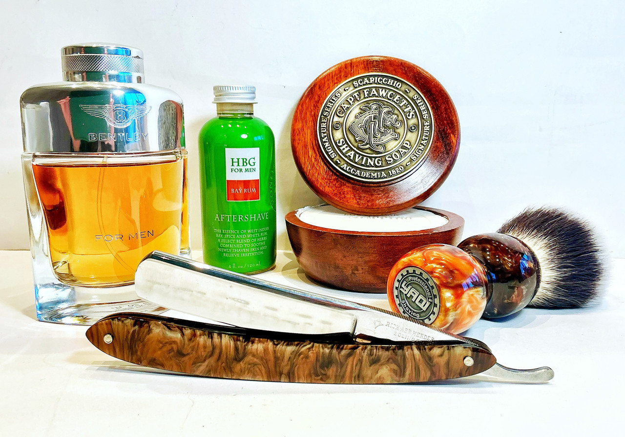 Martin de Candre: Huile végétale camomille et citron pre shave. Capt. Fawcett’s shaving soap, Scapicchio. Yaqi Caramel Cat’s Whisker: Synthetic hair, resin handle. Rich Abr. Herder, 5/8, Solingen, Copper/Coffe sided ripples acrilic scales by Pablo Fuertes. HBG for men, bay rum, lotion aftershave. Bentley for men, EdT.
