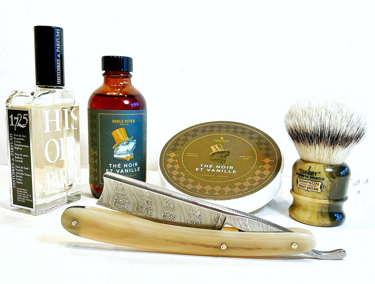 Floïd oil pre shave. Noble Otter, Thé noir et vanille, shaving soap & lotion aftershave. Simpson Chubby 2, synthetic bristle, horn handle. Böker Manufaktur: Damascus 6/8, Horn scales. Histories de Parfums, 1725, EdT.