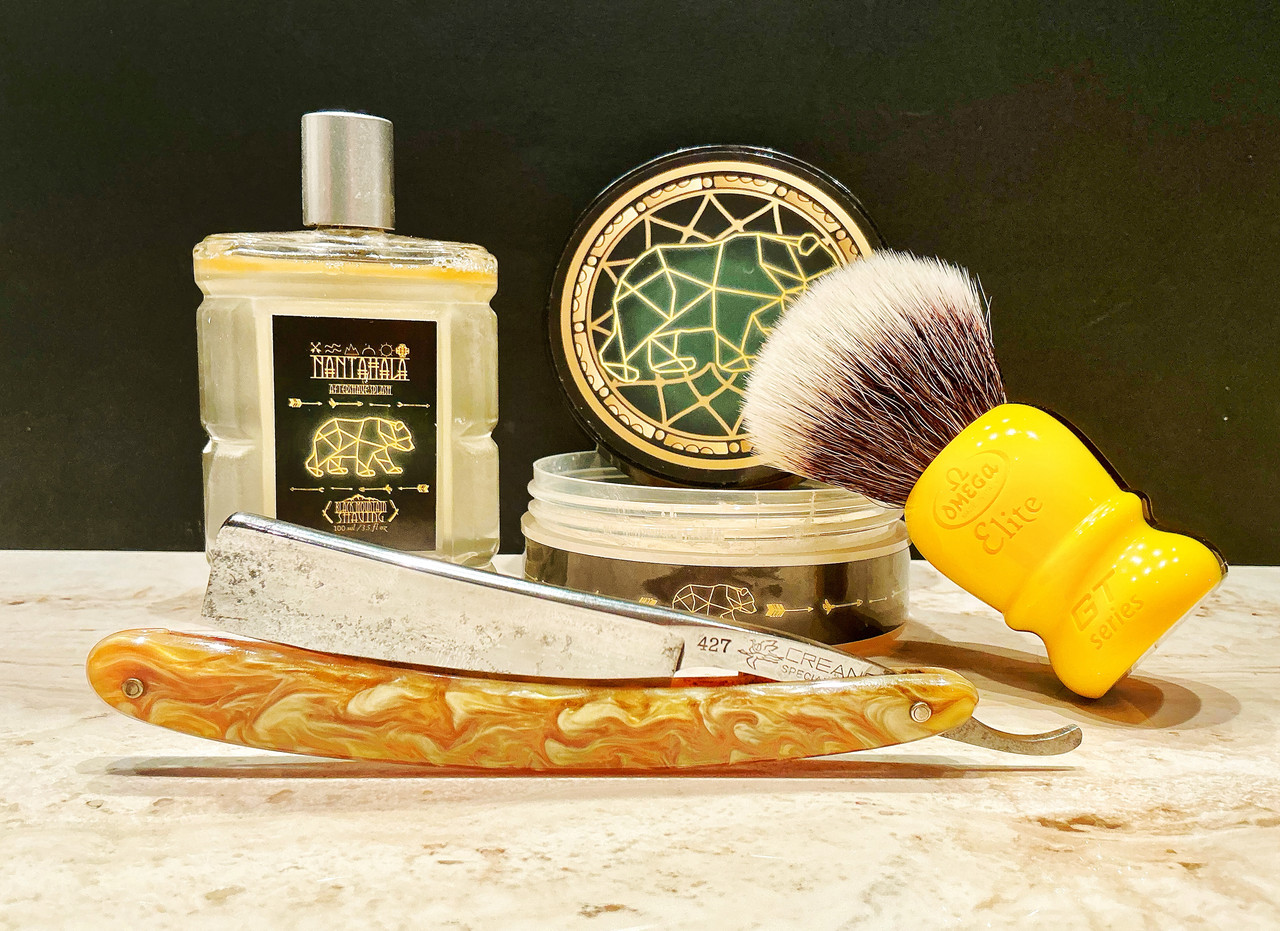 Floïd oil pre shave. Murphy & McNeil: Nantahala, shaving soap & aftersave. Omega GT Series, synthetics MB1941, 29x52, yellow handle. Creane 427, silver steel, 6/8, Japan.