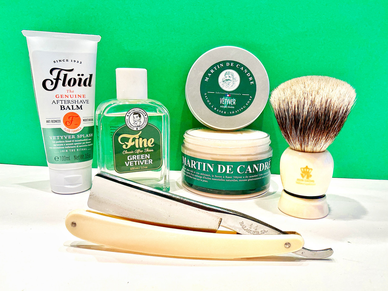 Floïd pre shave oil. Marin de Candre, Fougere, shaving soap. Rein Dachs Badger Shaving Brush Silberspitz. Balaguer S.A., 14. Fine, vetiver, lotion aftershave. Floïd, vetiver splash, balm aftershave.