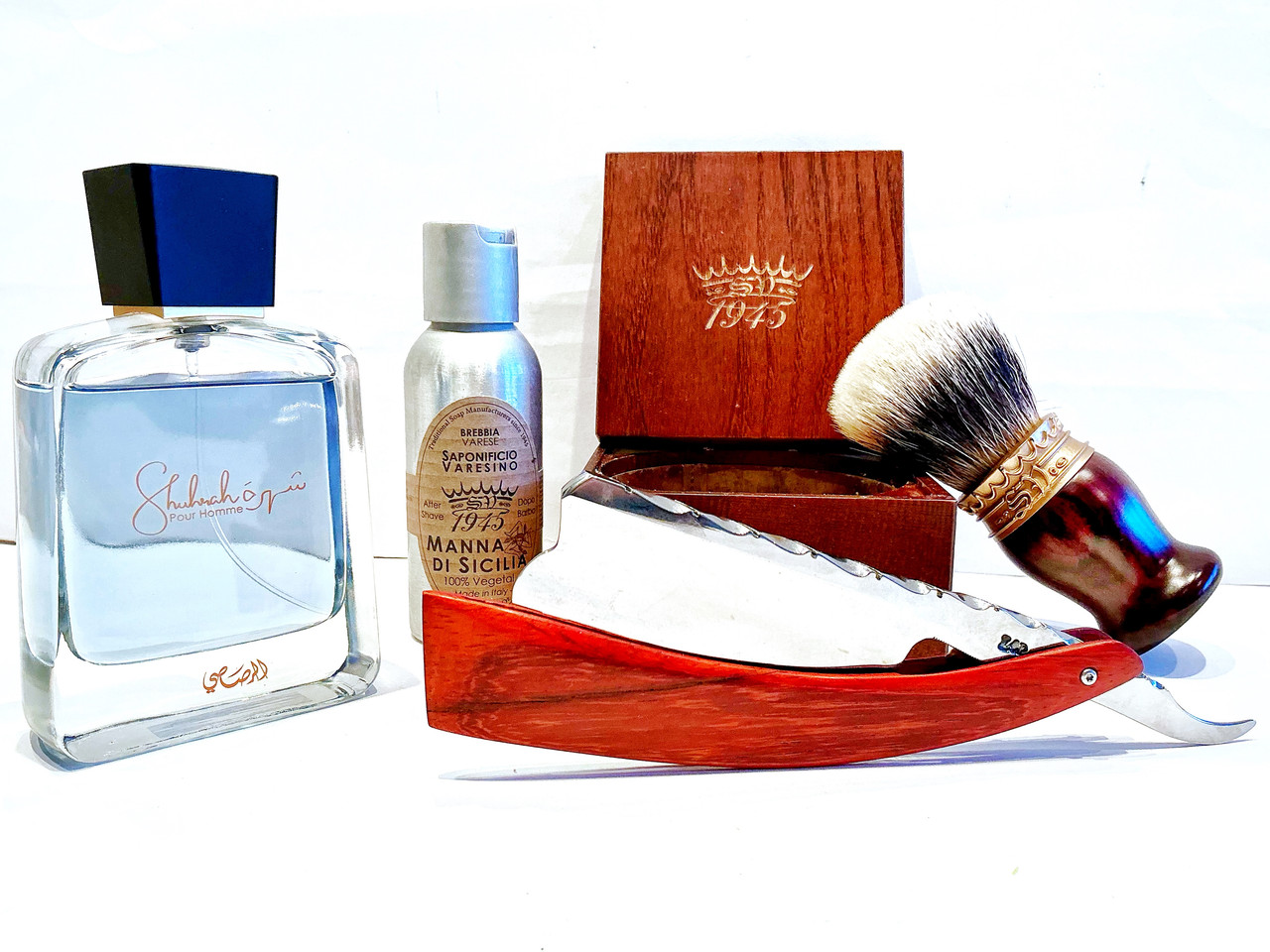 Floid, pre shave oil. Saponificio Varesino 1945: a) Manna di Sicilia: Shaving soap & b) lotion aftershave, c) Two-band badger, hight mountain, cocobolo handle. Forgia Pizzi, Spanish point, K720 steel, Spanish point, 10/8, Indian wood scales. Shuhrah Pour Homme Rasasi, EdP.