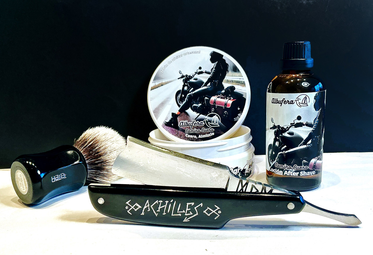 Floïd oil pre shave. Albufera shaving soap: Camino cuero, shaving soap & lotion aftershave. Thater 4125-3, two bands baddger, silvertip bulb, 28x56, black.