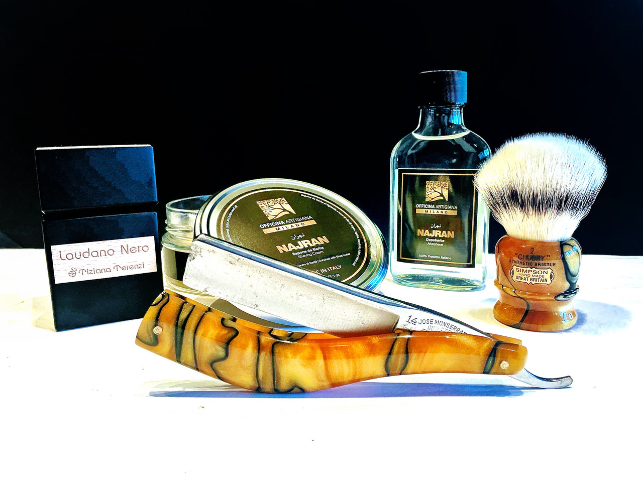 Floïd oil preshave. Officina Artigiana, Najran: Shaving soap & lotion aftershave. Simpsons, Special Edition Chubby 2 Synthetic Fibre Liquid Gold. Jose Monserrat Pou: Filarmónica 14 Doble Temple, custom Liquid gold kirinite scales by Pablo Fuertes @Airforce. Tiziana Terenzi: Laudano Nero, Extrait de Parfum.