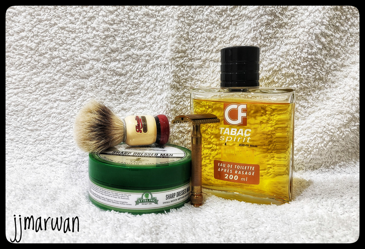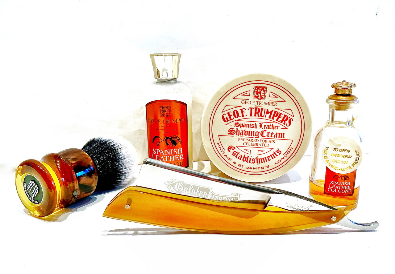 Geo F Trumper, Spanish leather: Skin food, pre and post shave, shaving cream & EdT. Wolf Whiskers, Chubby, 24 mm black Wolf synthetic bulb, Burnt Oak Whiskey handle. Galatea especial 14, swedish steel, custom horn scales.