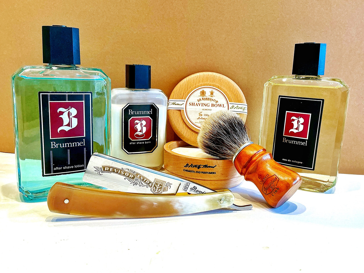 Revisor Extra, carbon steel 8/8, blond bone scales. Brumel: Lotion & balm aftershave, and EdC.