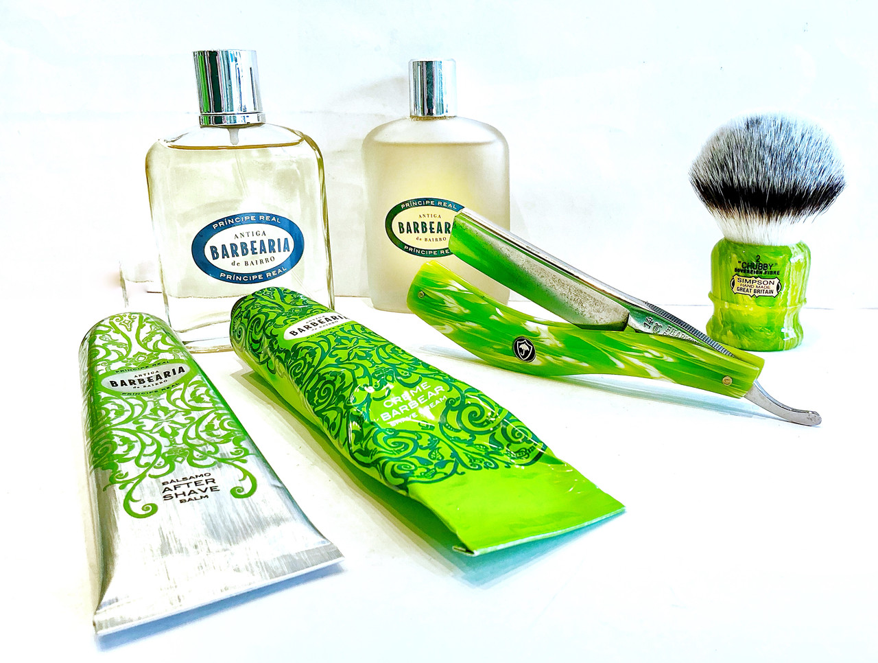 Floïd oil pre shave. Antiga Barbearia di Bairro, Principe Real: Shaving cream, lotion, balm aftershave & EdT. Chubby 2, sovereigh fibre, Lime Swirl handle. Filarmónica 14, Doble Temple, Lime swirl custom scales por Pablo Fuertes