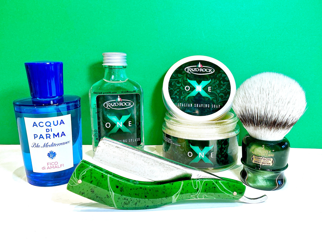 Martin de Candre: Huile végétale camomille et citron pre shave. RazoRock, One: Shaving shoap & Aftershave lotion. Simpson, Chubby 3, Platinum Fibre, Emerald Candy handle. Jose Monserrat Pou, Filarmónica 14, Doble Temple, Pepper jade kirinite custom scales by Pablo Fuertes. Acqua di Parma, Fico di Amalfi, EdT.