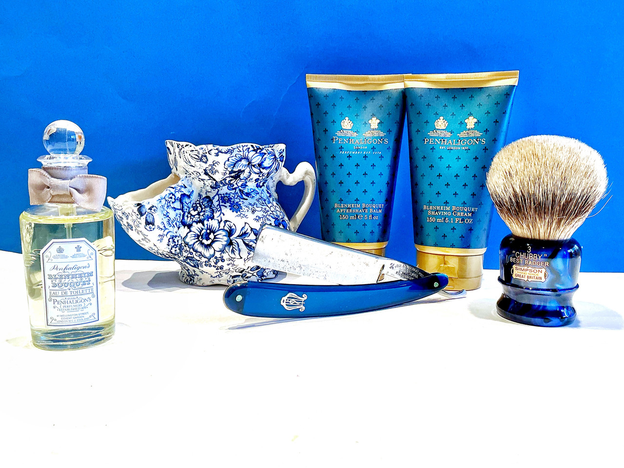 Martin de Candre: Huile végétale camomille et citron pre shave. Penhaligon’s: Blenheim Bouquet, Shaving cream, aftershave balm & EdT. Simpson Chubby 3 best badger, faux sapphire. Jose Monserrat Pou, Filarmónica 14 Doble Temple.