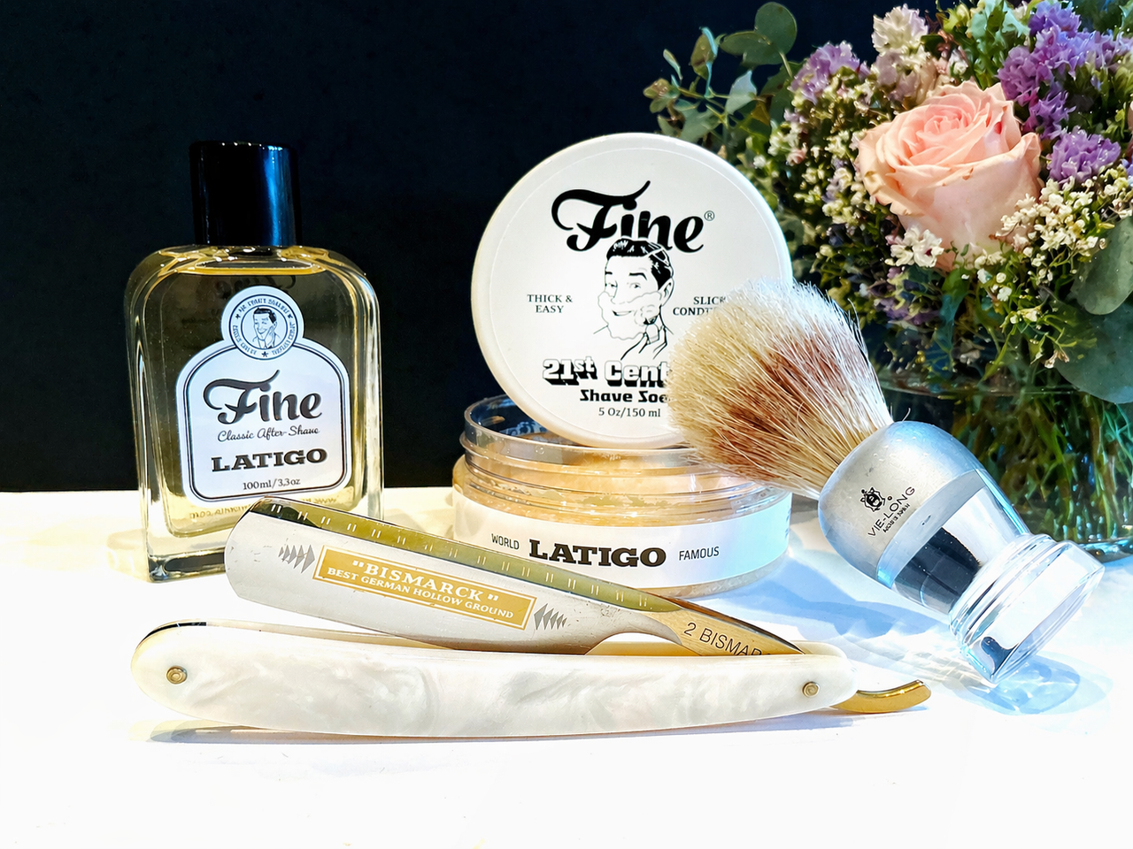 Floïd oil preshave. Fine Accoutrements, Látigo: Shaving soap & Lotion aftershave. Vie-Long 13063, white horse hair. Dovo, Bismarck, carbon steel 6/8, faux mother of pearl scales.